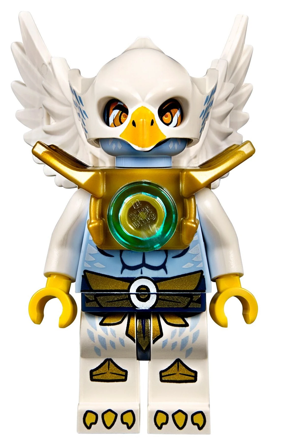 The set is made with a colour-scheme of mainly white, with flashes of blue, and a few yellow parts. The front of the acro-fighter is built with an arch piece in white, with a small yellow 1x1 piece, to make a beak. Behind that is a small handlebar, in a light grey shade, held up by a white piece. There is room for one minifigure to either stand of sit, and room behind it for the eagles' wings to have room to fit. Below that is a blue wing piece, held by a 2x4 piece in a brick yellow shade. An angle plate in front of it, with a rail on each side, holding up the two undercarriage pieces, used to hold the small ship up. In total, there are 21 pieces in the acro-fighter, without the minifigure and the CHI.