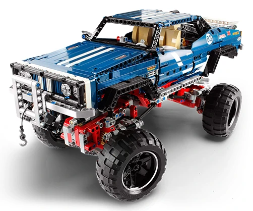 41999 4x4 Crawler Exclusive Edition is a TECHNIC set released on August 1 2013. It contains 1585 pieces to construct a blue and white Monster Truck based on 9398 4x4 Crawler, the major mechanical difference being an operating winch and working front lights. Only 20,000 copies of this set have been produced with each set's production number featured on the number plate. The blue Technic pieces, the wheels and the chrome Technic pieces are unique to this set, as is the packaging with the inside of the box featuring all of the Technic designers' signatures.