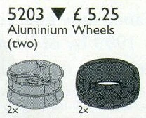 5203 Alloy Wheels with Tires is a TECHNIC set released in 1999. It includes two 70 x 28 mm metallic silver wheels, and the matching tires.