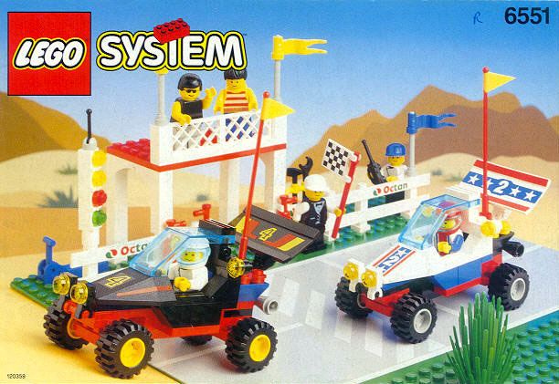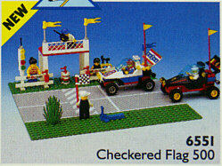 6551 Checkered Flag 500 is a Town set released in 1992 as part of the Race line. It contains a baseplate with the start/finish line of a race track, two cross country race cars, a grand stand, a pit stop and six minifigures, including two race drivers, race organizers and spectators.