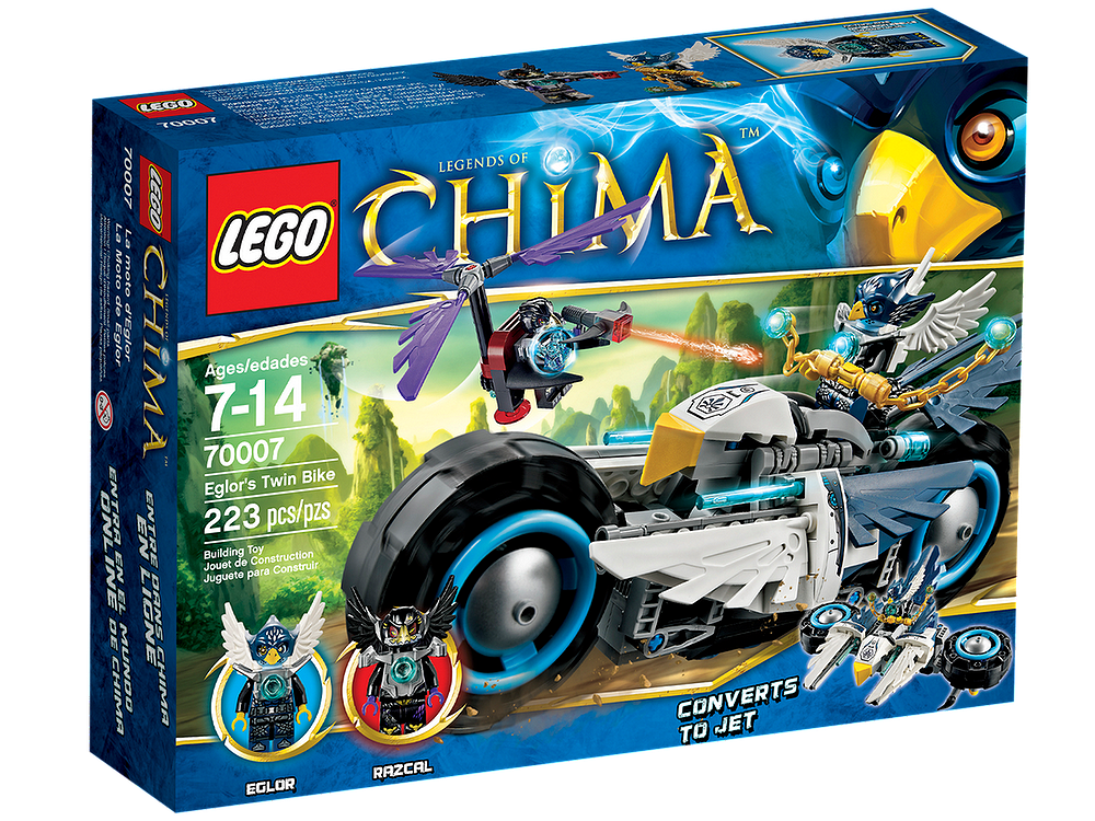 70007 Eglor's Twin Bike is a Legends of Chima released in 2013. The set takes the form of one large motorcycle and a small helicopter, with the bike plioted by Eglor and the aircraft piloted by Razcal.