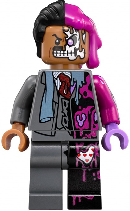 70915 Two-Face Double Demolition is a The LEGO Batman Movie set in the theme released in June 2017. It includes Batman, Two-Face, and two Gotham City police officers. Two-Face has a bulldozer with two distinct styles, split down the middle- one side plain and the other modified with spikes, grating, tubing, and a six-stud shooter. Batman has a motorcycle dubbed the "Bat Hawk"- a two-wheeler with an enclosed cockpit and two stud shooters on each side. Two pieces of cautionary fencing (complete with lights) are also present, as is extra ammo.
