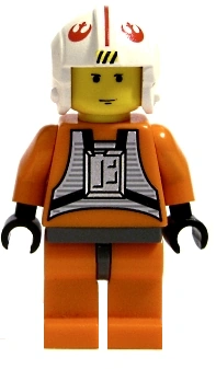 The Snowspeeder is mainly built up of light stone grey and orange pieces with a 6x16 tan baseplate. On the left and right of the ship are tilted wings, which can be moved up and down, with orange radiators and grey tiles on top of it, as well as the two main guns. Behind the main guns are dark stone grey fins, and two grey and orange sloped pieces, connecting the wings to the back of the ship. On the back of the ship is a black engine, and also the grapple gun used to bring down AT-ATs on Hoth. At the front of the ship is a sloped piece with a decal representing an orange design a gray vent above it. The cockpit is just above, a transparent piece that can be moved up and down, for the pilot to control the ship. Behind the pilot's seat is the gunner and co-pilot's seat, with a transparent windshield in front of him that can be moved up and down and a computer brick with a picture of an AT-AT in crosshairs.Between those is a box for storage of Luke's lightsaber hilt.
