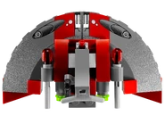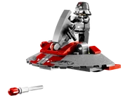 The set includes a speeder for the Sith Troopers and four minifigures: two Sith Troopers and two Republic Troopers. The speeder has two curved pieces that slope backwards at the bottom. In the middle is a sloping piece that is hinged upwards with controls at the back of it. Next to this are two flick-fire missiles.