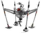 The homing spider droid is made up of 5 parts, the body and 4 legs. The legs are attached to the body by TECHNIC beams, and are moveable to positions that can make it appear to be walking. The body resembles a sphere, and has 3 eyes on the top half. The top half of the body can spin in a full circle, to enable the droid to see it's surroundings. The droid has to laser turrets, one on top, one on bottom. The bottom turret is on a hinge and can move up and down. It has a tube on it for detail. The top turret is like a smaller version of the bottom turret. Though it cannot move up in down, it has been adapted as a Flick Missile for more playability.