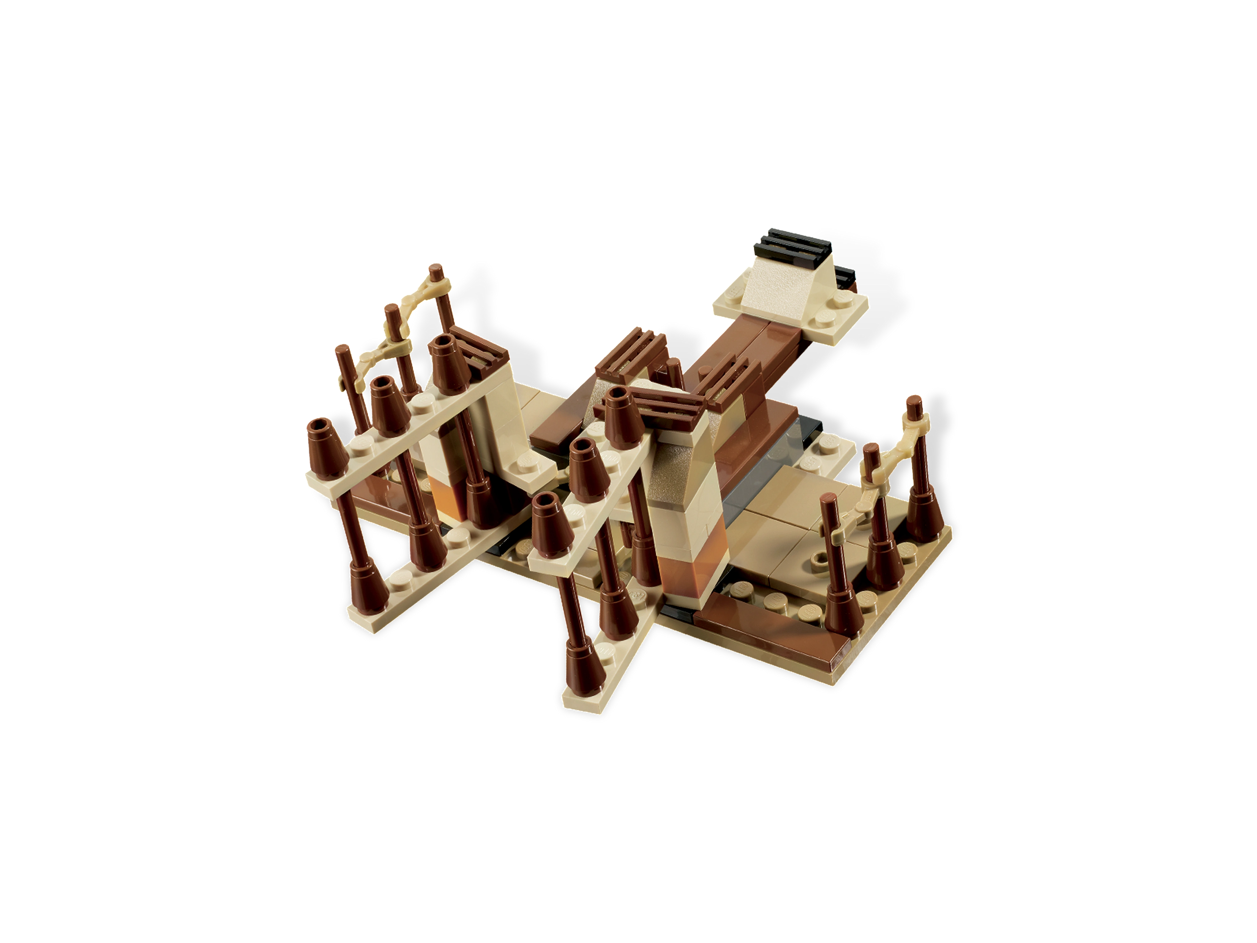 The set is made up of three different platforms. The first is the weapon's rack. There is nothing much to it, except many weapon holders for Ostrich Jockeys to hold their items while they race. On the left bottom corner is a Part 30176, which is Plant Brick 1 x 1 Round with 3 Bamboo Leaves. The weapon holders have two spears, the Ostrich Jockey's whip (box art and images only), and a battle axe. Also in the back is a golden flag and pole, which is used again on the Watching Tower.