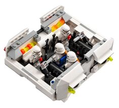 Two blasters are located on both sides of the cockpit, with firing cannons next to them. These cannons appear to be small, as only the tip of the barrel is visible from the outside, but they are actually very large and can be fired from inside the stormtrooper holding area. That holding area can hold four stormtroopers and two extra blasters.