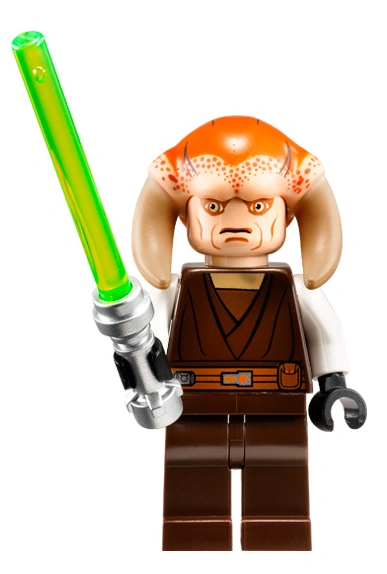 This Jedi starfighter has a dark green and white colour scheme with some flashes of gold and grey and its shape is based on that of the wedge-shaped Delta-7B Jedi Starfighter. The starfighter has three landing struts which can be deployed for landing or folded up for flight mode. It also features four flick-fire missiles as weapons- two on top and towards the front of the ship, and two on the underside near the forward landing strut. The cockpit area which has the ability to seat one minifigure can be detached from the rest of the vehicle, and function as an escape pod. Just in front of the detachable area is space for an Astromech droid to sit in. Several stickers are used for detailing on the ship, including the Republic symbol on the right-hand side of the ship. This set includes three minifigures- Saesee Tiin, along with Even Piell and R3-D5 who are both exclusive to the set.