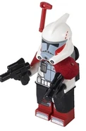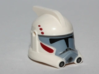 Hammer has dark red legs with white and grey armour printing on the front. His torso is white, with grey printing representing the front plate of the ARC trooper armour, a white belt outlined in black, a grey magazine in the top right-hand corner, and four red squares on the left. The torso has black hands, and also features printing on the back, detailing a backplate and other aspects of the armour. Hammer's head piece is flesh-coloured, and has the standard Clone Trooper face design, with brown eyes, black eyebrows and a serious expression. The helmet piece is of a mould currently exclusive to this minifigure , based on an ARC trooper helmet used before Phase II armour was distributed to clone troopers. The helmet features the large crest present on Phase I helmets, and but also has some features found on Phase II helmets, most notably around the bottom of the helmet. He is white, with grey printing around the face area, with flashes of red on the sides. Black is used for detailing the various parts of the helmet, including the visor, and a red design is also used around the face, and three red dots are present on each side above the visor. Hammer comes with several accessories, and the minifigure is constructed in a period of seven steps in the instruction booklet. A black cloth kama piece is used and folded around between the legs and the torso pieces, while a piece dark red cloth is folded to form a double-sided pauldron, which goes on the torso's neck. Next, a light grey bracket goes on top of the pauldron before the head piece is put on, and a further three pieces are used for a brick-built backpack, which is constructed and attached to the bracket. Lastly, as the helmet piece can be outfitted with attachments like other clone troopers in The Clone Wars theme , a red rangefinder is attached to the right-hand side of the helmet. Hammer also came with an antenna and visor.