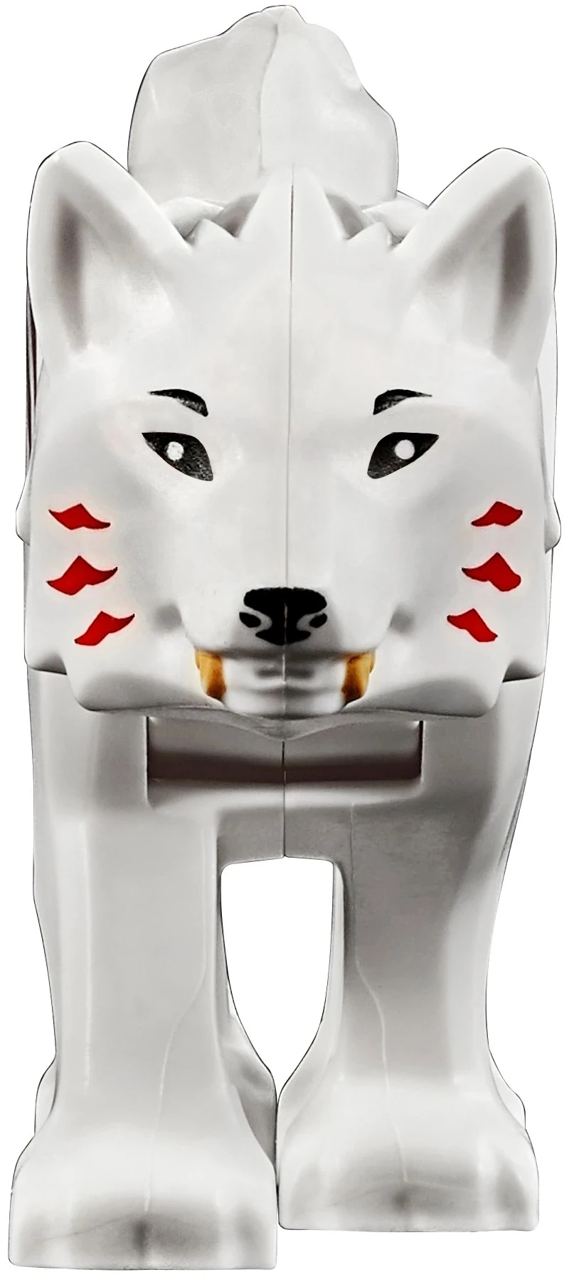 In wolf form, Akita's body is all white except for the red tips of her multiple tails, three red markings on each cheek, and black nose, eyes, and eyebrows. Her mouth has visible fangs jutting from it, and her head can be moved up and down. The rest of the body is, like most LEGO animals, completely rigid, frozen in a position with the tails extended straight out behind her. The legs are all in different positions, with her two left legs positioned close to each other while her right legs are spread further out, the right front leg extending further than the front left leg.