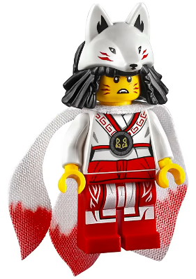 In minifigure form, Akita has unique printing on her legs and torso depicting white and red robes, with the white being more prevalent on her torso and the red more prevalent on her legs; her torso also features a circular black decoration with a yellow wolf head symbol. She comes with a split cloth cape, mostly white but with red tips, matching the multiple tales of her wolf form. Her head is printed on both sides, each print featuring three red marks on her cheeks matching those of her wolf face. One side features a tense frown, while the other depicts a cocky smile; both expressions show her teeth, which include fangs. She comes with a unique hairpiece depicting shaggy, shoulder-length black hair with a white wolf mask resting atop it.