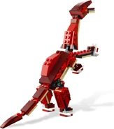 As one of the 3-in-1 models featured in 6914 Prehistoric Hunters, the Apatosaurus is comprised largely of bright red, dark red, and Brick Yellow bricks. It measures over 11 inches (29cm) long and has an opening mouth, a movable tail, and poseable legs.