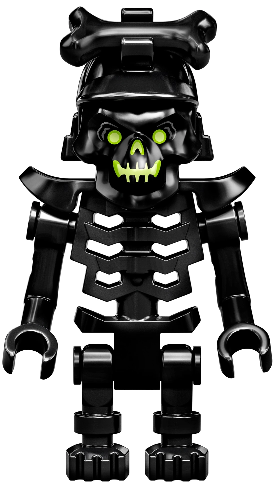 The Awakened Warriors use all the same parts as Ninjago: Legacy Kruncha, but coloured in all black with green printing on the face of the skull part. A black version of the bone part previously used in Lord Garmadon's helmet is also included.