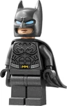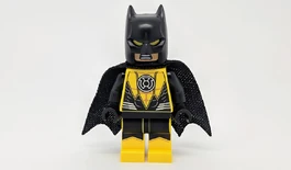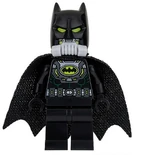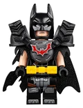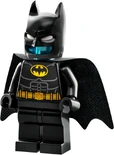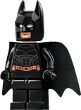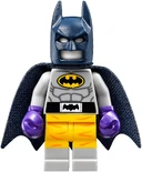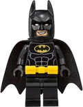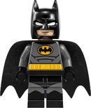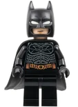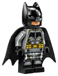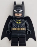 The other variation released in 2012 is similar to his 1990s comic black suit. It has the same logo and shape as the Blue Super Heroes variation, but against a Black torso. Batman's hips, hands, cowl, and cape are also black. His utility belt is now much larger and clearly has a large, yellow buckle, similar to the Classic Comic suit, but not in gold and reversed. There are four rectangular packets on the belt. He has back printing depicting the back of the belt and the suit's cut on his back. Batman's face is the same one used on the Blue Super Heroes Suit. This variant is used in The LEGO Movie but is identical in the set he appears in for the theme.