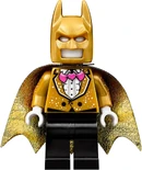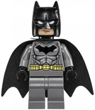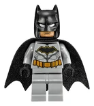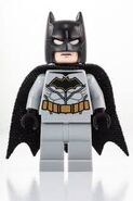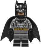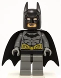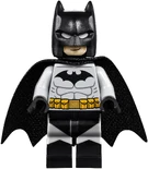 The original suit was first released in 2006 within three sets, and later in KC7782 The Batwing with Joker Key Chain in 2007. This variation resembles Batman's appearance in The New Batman Adventures and Batman: Hush. This variation is made from five pieces: headgear, head, cape, torso, and legs. Batman's headgear is a Black, bat-shaped cowl with two holes for eyes, a rectangular section cut out for his mouth, a nose which juts out, and two "bat ears". Batman's head is Light Nougat with two eyes, a frown, and a White headband above his eyes. His cape is also black like the cowl and has five triangular points at the end. The torso is Medium Stone Grey (with Black hands) and has a printed pattern of a black Bat Logo, toned core muscles, and a Warm Gold utility belt with ovular packets and a square buckle. His legs are black and left unprinted.