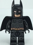 Batman uses the same Black Bat-like Cowl and Five Pointed Cape as all of his previous variations for his 2011 Comic-Con exclusive suit, with the exception of the Classic Variation which included those parts in Earth Blue. Batman's new head is slightly different, with more of a scowling mouth. The eyes and headband are virtually the same as previous variations. Batman's torso, arms, hands, and legs are all black with printing on both the front and back of the torso, which is an updated print of the 2008 Film Suit Torso. His utility belt is still Warm Gold, but is now much more detailed than the previous variation. The armored printing on the torso is also much more rounded than that of the previous variation.
