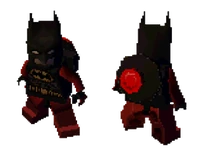 The heat protection suit is very similar to the Comic Suit, but Batman's torso and legs are now Red. His Gloves, Cowl, and Cape are all Dark Red, and he has a pair of goggles fixed in place over his eyes.