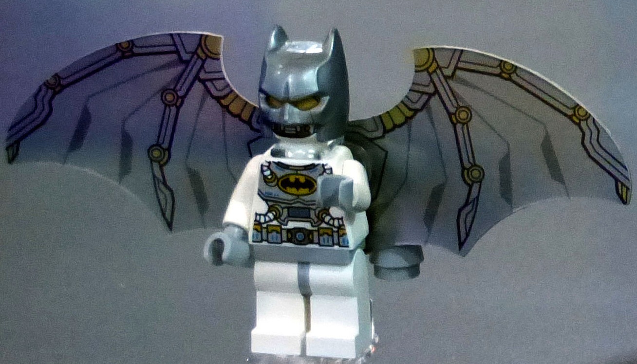 In 2015 Batman has a new spacesuit. Batman wears a new silver cowl over his face with openings over his orange eyes and now his mouth and chin. The brow is moulded into a permanent scowl and has two shorter bat-shaped ears poking up. The expression revealed through the opening over the mouth is a breathing mask. Batman wears a bulky costume with space gear, this time the suit is white. A yellow oval is one his chest with a black Bat-symbol inside. He wears a white utility belt with a hexagonal buckle and a high-tech packet on either side. He has light grey gloves and hips. He has a Jetpack connected by a transparent white connector. The "Cape" is made of thin plastic to achieve the look of wings. You can de-attach them and add a new cape to the jetpack too, which is speculated to have a closed wing design.