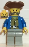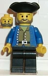 Black Jack Hawkins' appearance varies between sets, but he is consistently depicted wearing a tricorne (usually black, but sometimes earth orange) and a bright blue jacket over a brown button-down shirt. He usually wears grey pants, but has also been shown with black or dark green pants, and even with a peg leg in 6248 Volcano Island. His face, shared with Colonel Colt Carson, gives him a dark grey beard.