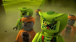 The ninja then head to Ninjago city to stop the tribes uniting. They then use the power of rumours to their advantage to stop the tribes uniting but are all captured except Zane because of his pink outfit blending in with a poster on the wall. Zane then frees the others but is pursued by Pythor, Skales, and the other Serpentine. Zane then uses his Shurikens of Ice to freeze the floors, and then everyone gets on his snowmobile, and they escape, while Pythor and other Serpentine are slipping on the icy floor that Zane created.
