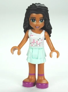Chloe wears violet flip-flops and anklets, and has bare brown legs. She wears a turquoise skirt, and a white top with a design of pink and silver pixels printed on it. Her long, brown arms are bare. Her face is also brown, and she has dark green eyes and light pink lips. Her hair is long and black.