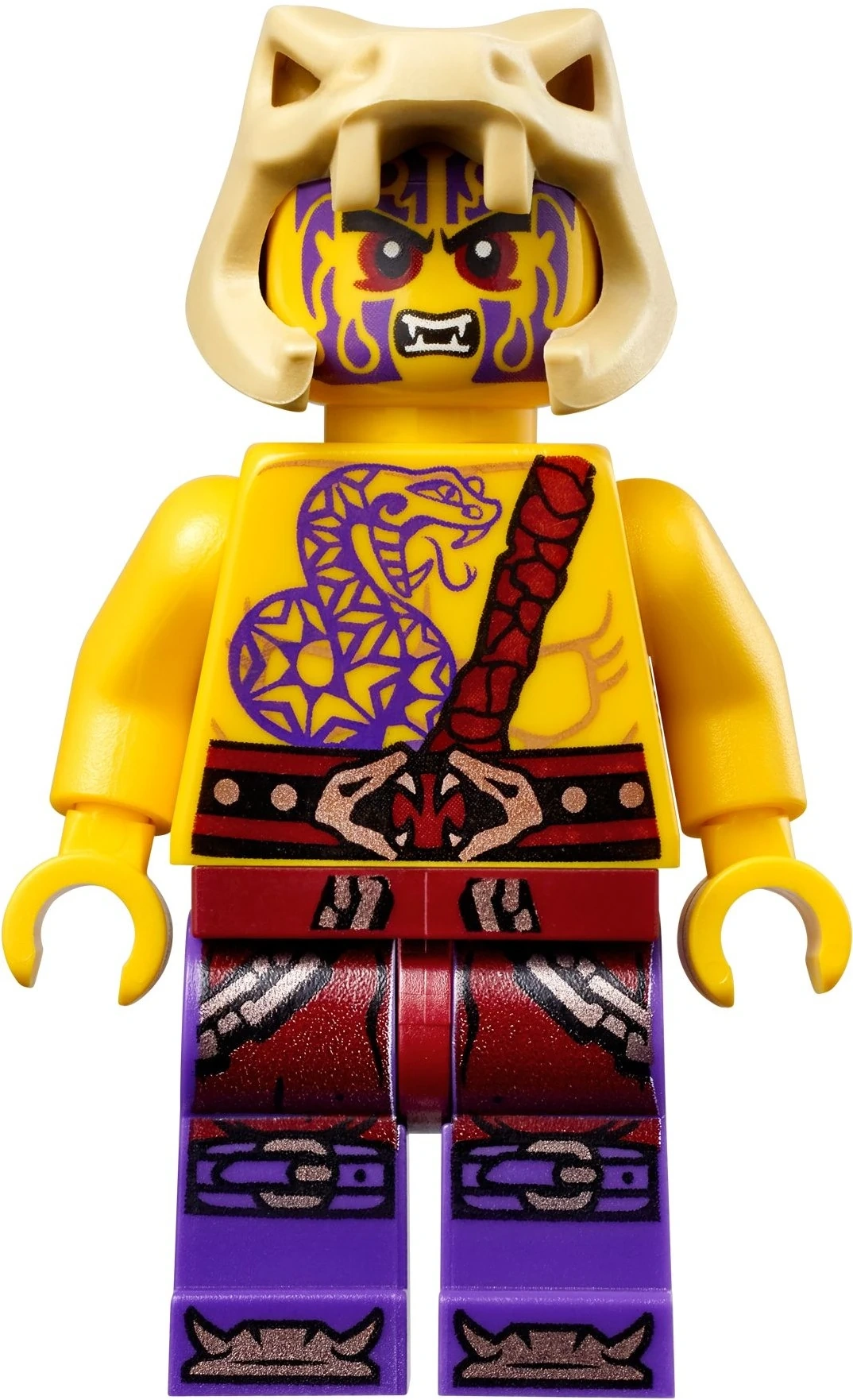 Chope has a unique face print, with purple tattoos surrounding his facial features; these include black eyebrows. He has red makeup around his eyes, and his lips are parted in a snarl to reveal his teeth. Chope also has a unique torso print, but shares his bone helmet piece with Kapau, Krait, Sleven, and Zugu. He shares his legs with Eyezorai and Kapau.