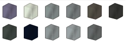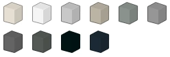 There were ten colours under this main colour including Phosphorescent White †, White, Light Stone Grey, Light Grey †, Grey †, Medium Stone Grey, Dark Stone Grey, Dark Grey †, PC Black IR †, and Black.