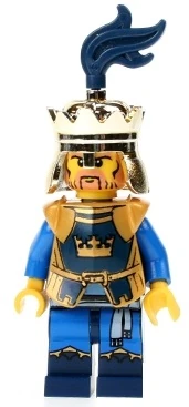 Crown King Brutus features a metallic golden crown, printed breastplate, and a dark blue cape. His head and original torso are both recycled from the Vikings theme. In 2009, a new version was released with a new torso, printed legs, and a blue plume on the crown, but does not include a cape.