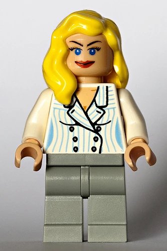 The Minifigure is given medium stone grey pants and a double sided torso depicting a white and blue striped suit. It has a cool yellow hairpiece that covers her right shoulder and a double sided head piece. It also made an appearance in LEGO Indiana Jones: The Original Adventures where it appeared with a green jacket, green eyes, and a different new hair piece, probably due to the fact that the other Minifigures, Marion and Willie would have looked almost identical. It also appeared in LEGO Indiana Jones 2: The Adventure Continues, where it is changed to the real appearance, except for the game's new hair piece.