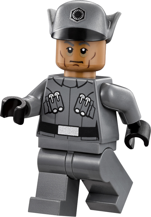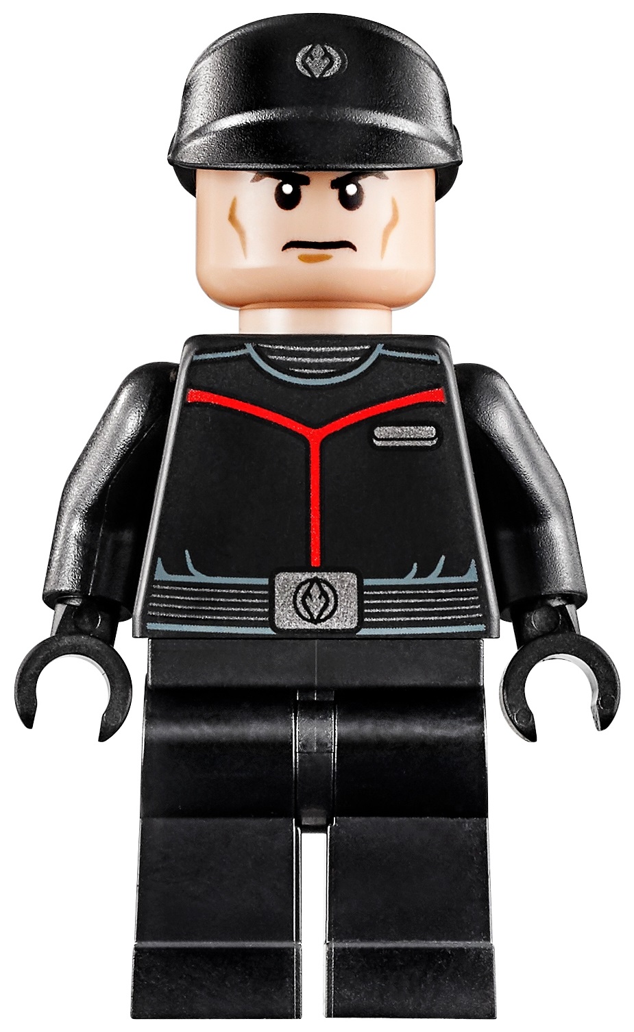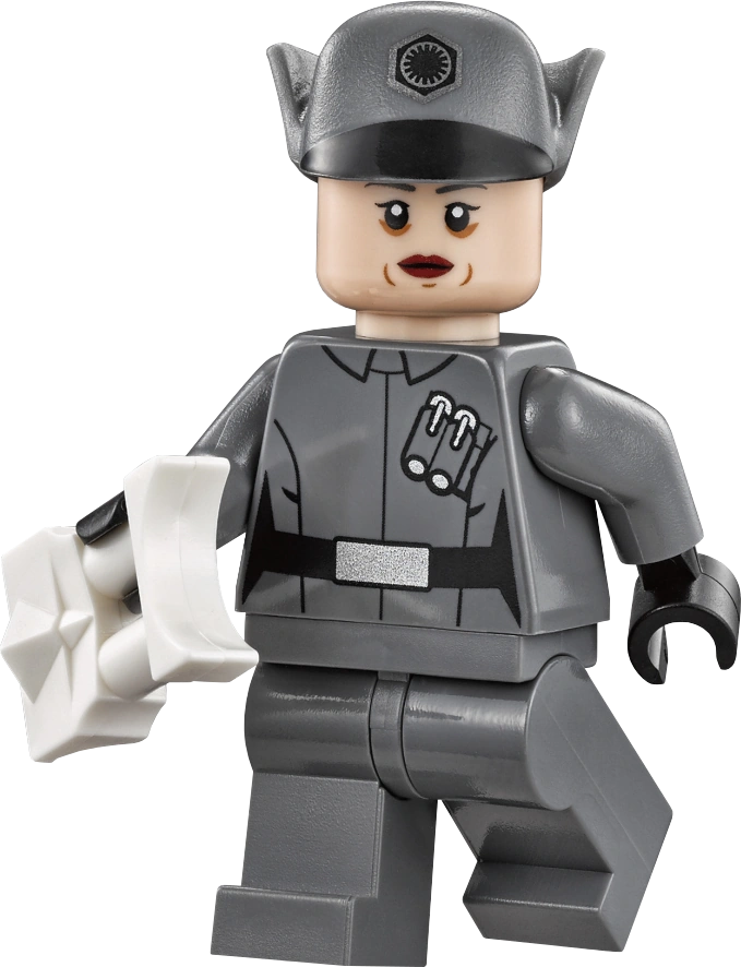 The First Order Officers are Star Wars minifigures, first released in 2015. They appear four times in four sets, each time being slightly different. In 75101 First Order Special Forces TIE Fighter it is a grey uniformed officer with two breast pockets. In 75104 Kylo Ren's Command Shuttle, there is a female grey uniformed officer with one breast pocket. In 75166 First Order Transport Speeder Battle Pack, it is a blue uniformed officer which is higher-ranked and therefore has no breast pockets. In 75190 First Order Star Destroyer the officer is a male wearing a uniform in a dark shade of gray with two breast pockets. In 75266 Sith Troopers Battle Pack, the minifigure labelled as a "First Order Officer" is a Sith Eternal officer. It has a black uniform with a thin red stripe, a silver belt buckle with the Sith Eternal emblem on it, and the Imperial Officer hat piece in black with the Sith Eternal emblem.