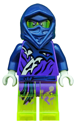 The Ghost Warrior's head is colored trans-light green with black eyes and black markings. His hood is dark blue and has a ninja mask covering his mouth, with only his eyes staying visible. His arms are dark blue. His torso has ghostly, spring green printing and purple robes with a dark blue belt. His legs are trans-light green with ripped, dark red pants just below the torso.