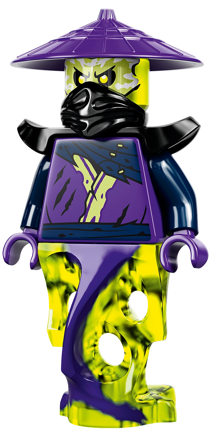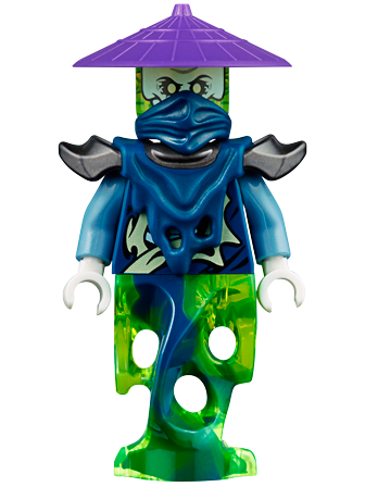 Ghoultar's head resembles a skull with light, pale eyes, the rest being transparent light green with a dark blue half-mask. He wears a purple straw hat as well. He also uses new ghostly black armor with dark blue robes on his torso and spring green, ghostly printing. The ghost's arms are sand blue and his hands are white. Ghoultar has a new, trans-green and dark blue ghost piece instead of normal minifigure legs.