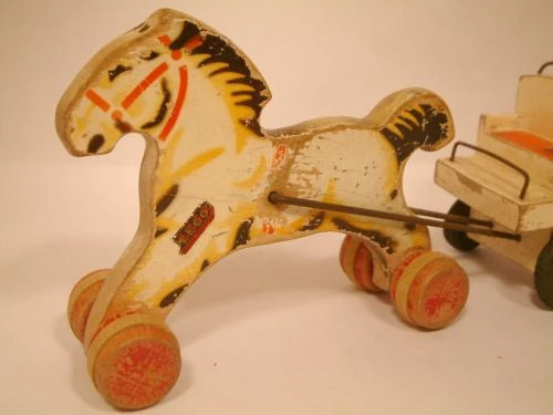 The very first known horse made by The LEGO Group was a wooden one that originally appeared in the Wood Toy Wooden Horse with milkcart. It was white, had wheels on its feet, and a black mane and tail.