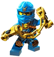 Jay's fifth variant for the year was his Golden Dragon version, which used new hood and wing pieces also created for the other original Ninja; all four sets are gold, with Kai's being molded in translucent yellow to distinguish it from the others. His head, arms, and legs were also molded in translucent yellow, and his dark blue torso along with his legs featured exclusive printing. The head was reused from his Spinjitzu Ninja Training variant.TBA