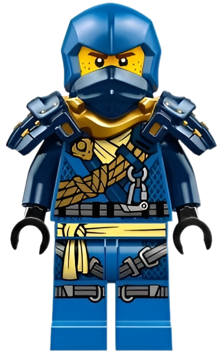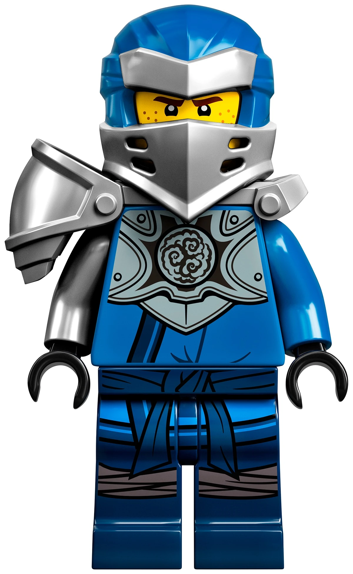 Jay also received a Hero variant for the Master of the Mountain theme, with torso and leg designs based on his Forbidden Spinjitzu variant but with added armor designs and a silver right arm. This Jay also sported a new silver shoulder armor piece, and a blue hood/helmet piece with silver metal elements around the lower face and forehead. Like Nya and Zane, Jay did not receive a Spinjitzu Burst variant.
