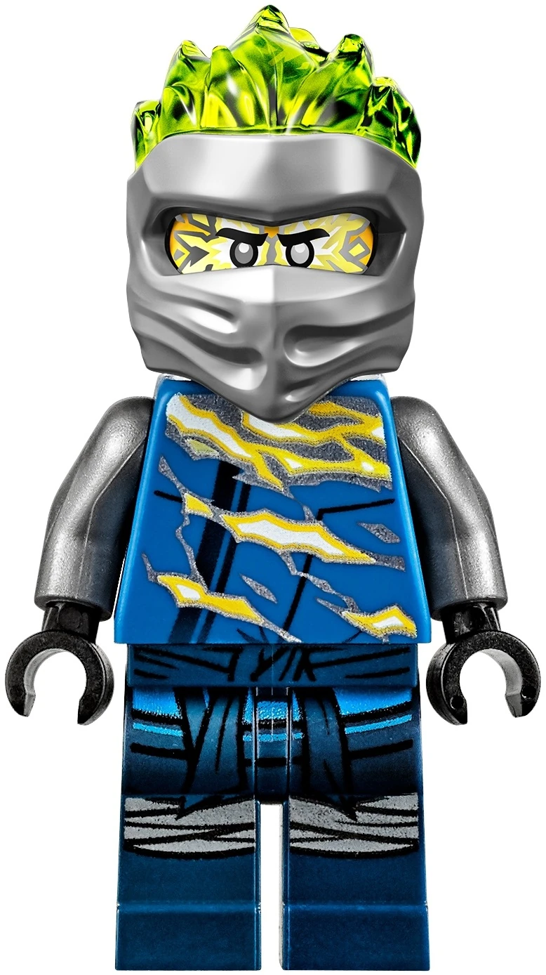 The other three Jay figures were released for the Secrets of Forbidden Spinjitzu season, all three coming with the same blue legs with a blue waist sash print. Two of the figures also had identical torsos and heads, but one came with a blue and trans-green Forbidden Spinjitzu hood, while the other came with a shoulder scabbard and the single piece hood now marked with a J in Ninjago script. The third figure has the same torso print as the previous two with lightning printing across it and silver arms, as well as a new head and a silver and trans-green forbidden Spinjitzu cowl.