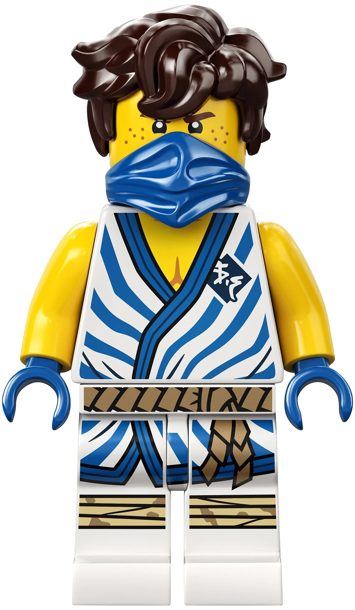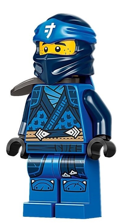 In the 2014 Ninjago: Rebooted sets, Jay receives a makeover, like the other ninja. For the first time, his hair piece appears with him. His mask, like the other ninjas', is like the ZX/Kimono masks, but it does not cover his head, only the mouth. (Cyrus Borg claims it's to prevent facial recognition.) His torso features a strap with a symbol like that of his Kimono's (the word "sheep" in kanji), lightning bolts across his uniform (reminiscent of his NRG form), and clips fastening the straps to his shirt. His pants are solid blue. His back looks very similar to his Kimono form.In 2015, four new Jay minifigures were introduced, two each for the Tournament of Elements and Possession story arcs/set waves. One figure shows Jay in sleeveless blue Tournament robes with a mask that covers his lower face and a hairpiece; this figure was rereleased in 2016 without the face mask. The second Tournament figure shows Jay in his full Ninja gi with various belts and straps and a single piece Ninja hood with a symbol on the forehead; in 2016 the figure was rereleased with a hair piece and face mask instead of the hood. A similar hood, minus the symbol, appears on Jay's Airjitzu variant, which also has a blue head and arms, and a black torso and legs, the latter of which are printed with a symbol and lightning. The final figure shows Jay in his Deepstone robes with blues sashes and a new blue and black hood; four releases of this figure came with black shoulder armor with a scabbard, while the fifth-from set 70731-did not.
