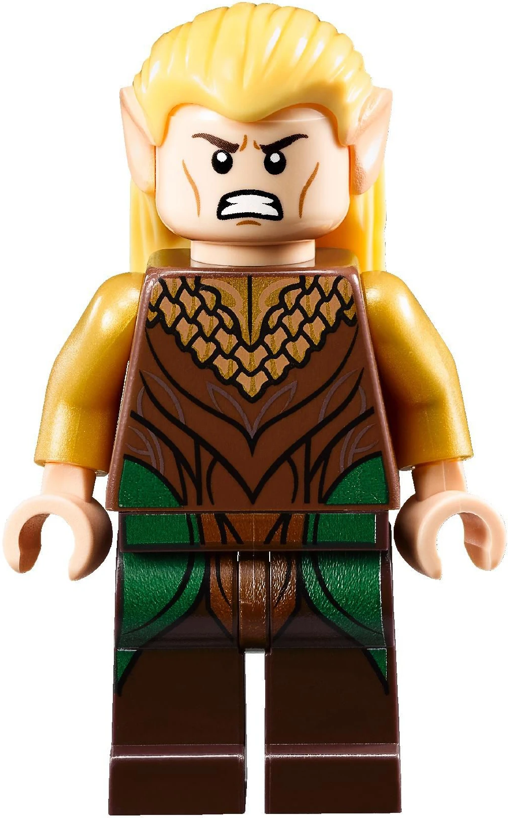 This variant appears in 79001 Escape from Mirkwood Spiders. The only piece the two versions have in common is the part that makes up Legolas's hair and ears. His face is double sided. On one side, he has a neutral, almost somber expression, with the eyes slightly larger than normal and the mouth turned down slightly. His alternate expression sports bared teeth and slanted eyebrows in a snarl. Two creases, one larger than the other, are located in between the brown eyebrows. One of his main recognizable features, the high cheekbones, are also present.
