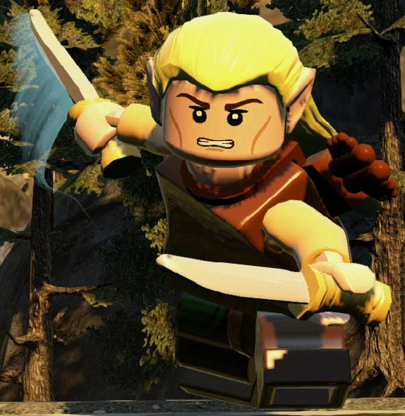 In LEGO The Lord of the Rings: The Video Game, Legolas' appearance is based on that of his physical The Lord of the Rings minifigure. In the game, his default weapon is at first an "Elven Bow", but after visiting Lothlorien, he is given a new longbow, "Galadhrim", which replaces his old one. Both of these bows have the same function- they can be used to shoot enemies and other objects, including targets which are only able to be hit by arrows. In close-quarters combat, Legolas automatically switches to twin daggers, which are based upon the daggers that Tauriel comes with in 79001 Escape from Mirkwood Spiders. However, these daggers can be selected to be out by default instead of the bow.