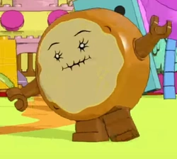 Cinnamon Bun resembles a large brown bun that has a gooey face due to being half-baked. He has small black eyes, but they appeared large and green in "Slumber Party Panic" and "The Enchiridion!" His mouth is misshapen and full of crooked teeth. Before "The Red Throne," Cinnamon Bun had a wrinkly texture that gave him a slightly elderly appearance. After being blasted by fire, he becomes fully baked and attains a dry, smooth face.