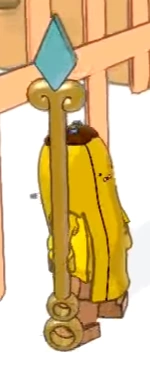 Banana Guards are chocolate-topped banana-type Candy People who guard Princess Bubblegum's Castle and Princess Bubblegum. The Banana Guards always appear in pairs prior to the episode "Princess Cookie," but due to their role in that episode, it's clear that there are a large number of guards that all wear the same banana peel armor. The last known leader of the guards was Root Beer Guy (prior to his death) after his predecessor, Captain Banana Guard, was either dismissed or demoted due to incompetence.
