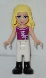 Liza has light nougat skin. Her eyes are light blue and her long blond hair is straight and braided at the back. Her hairpiece can be changed to a riding helmet with blond ponytail. Liza is dressed in a magenta sleeveless top with a white stripe around the neckline and flower decoration in front. She also wears white riding breeches and black boots.