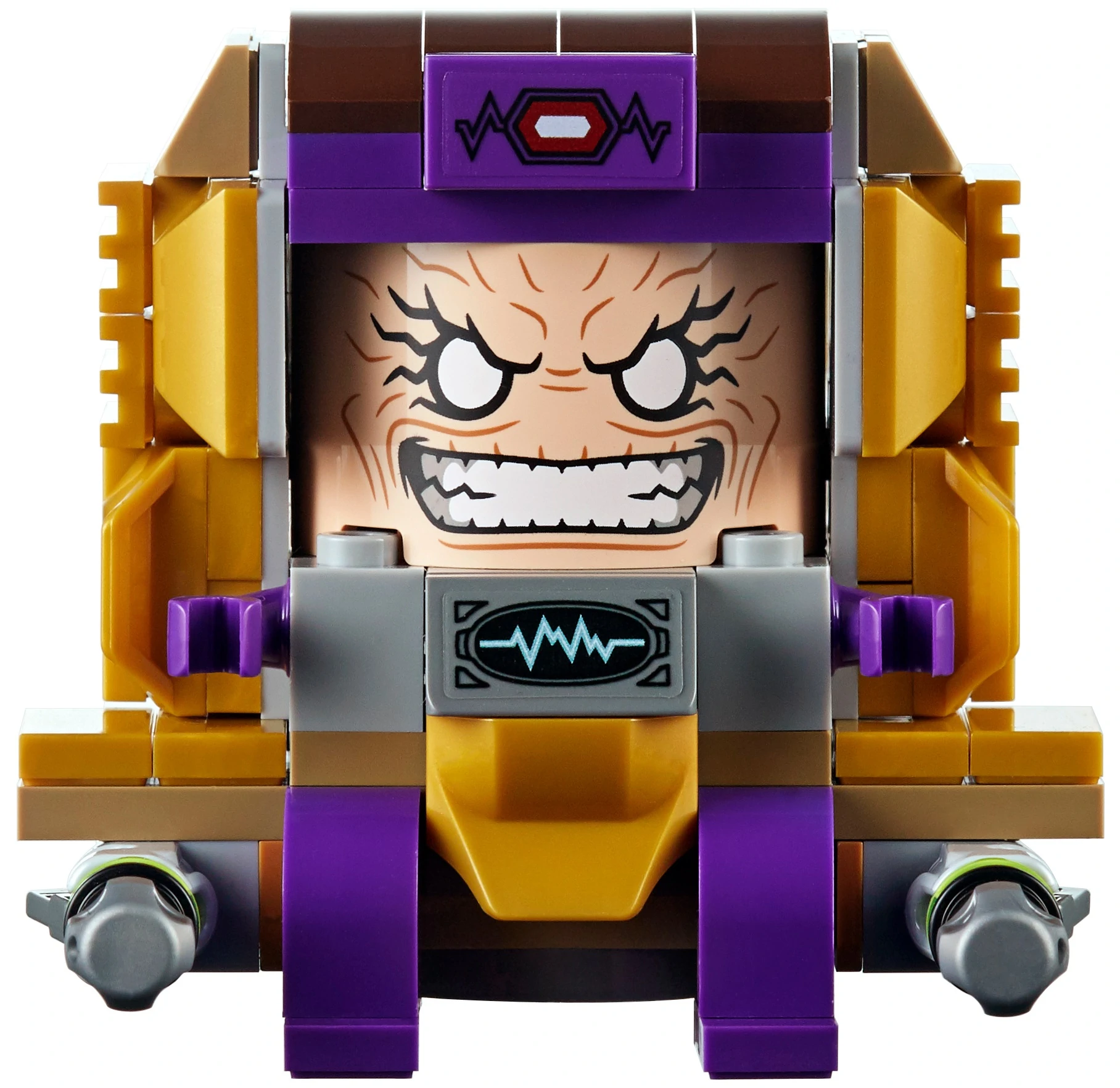 M.O.D.O.K. has a new large warm gold head mould depicting his dark brown hair, a purple headband with a red jewel in front, the front also has a large screen featuring a light nougat face with white eyes, wrinkles and a mouth all bent into an angry expression. He has a plain gold torso and purple limbs.