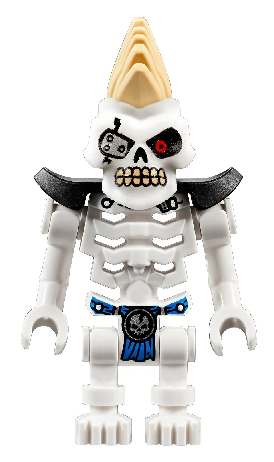 Nuckal features a newly moulded, white skeleton head with Light Nougat spikes on the top and a metal eyepatch over his right eye. He wears a black pauldron, that has blue spikes coming out from the sides. Nuckal's body is exactly like the other Ninjago skeletons' except he wears a blue loincloth. His arms and legs are used by the other skeletons as well.