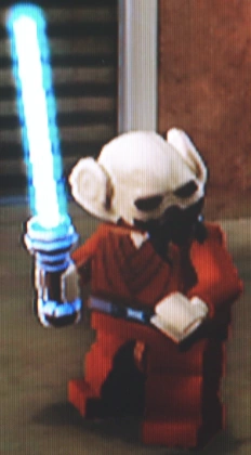 Prior to his release in minifigure form, a video game minifigure of Plo was made for LEGO Star Wars: The Complete Saga . This figure had a lighter skin tone and tunic than his physical minifigure, and his head was wider. Plo is armed with a blue-bladed lightsaber, can use the Force to attack, build, and manipulate objects and perform double-jump.