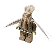 Poggle the Lesser is mostly sand yellow and features printing of gold and black apparel on his chest, back, hips and upper legs, all of it with intricate designs, depicting royalty. His stomach has no apparel and has printing of exoskeleton-like plates, printing that's continued on his lower back. Poggle's arms and hands are unprinted. A clear plastic cape-like piece wedged between his head and neck. It is split into four sections, each with slightly transparent brown wing printing.