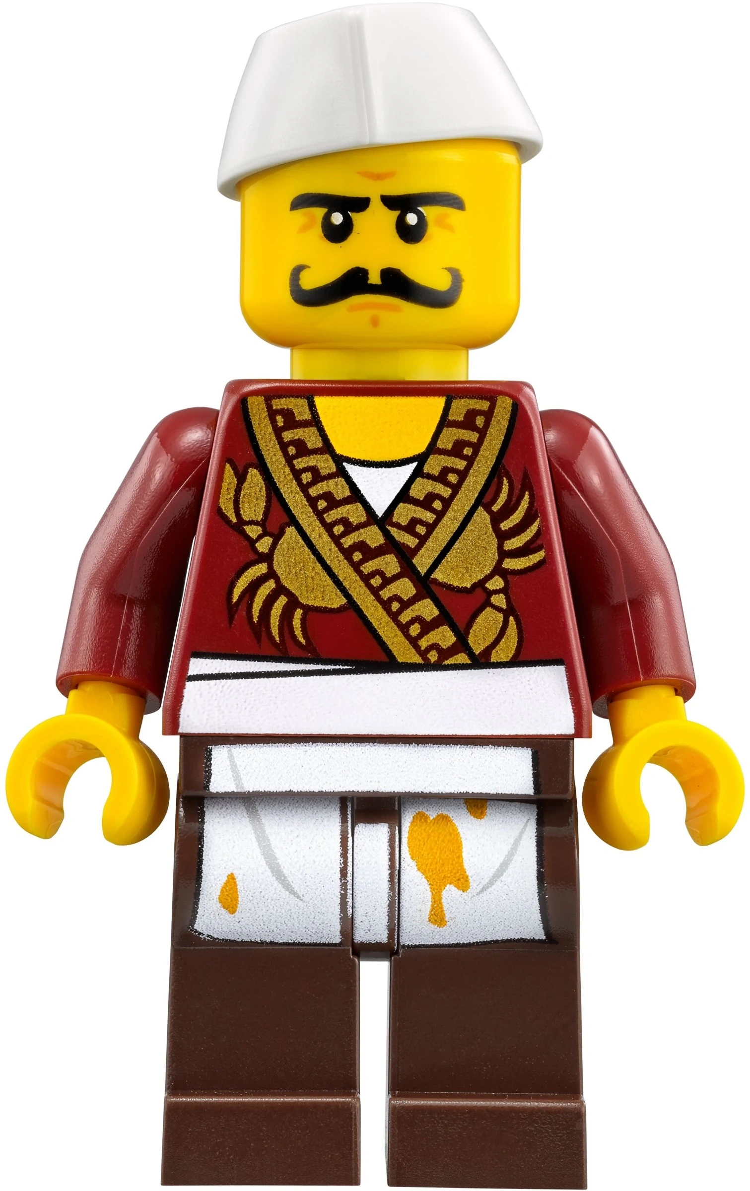 Severin Black is a chef who wears a white hat and a stained white apron over brown pants and a red shirt with golden decorations including crab symbols; a white undershirt is visible underneath. He has no visible hair on his head but sports a handlebar moustache.