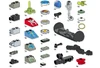 UFO was the first Space theme to feature true aliens. All of its minifigures were cybernetic in nature, and the race featured two wholly robot figures, and, as befitting its name, many of its spaceships used saucers or half-saucers as elements. It has the smallest proportion of wheeled ground vehicles to ships (two to nine) of any LEGO Space theme before or since. UFO was the first theme to introduce what has since become a staple of LEGO System sets in general: large pieces meant to provide effects (such as curvature) that would be difficult to achieve with traditional LEGO pieces. It's vehicles were all heavily armed, with Trans Neon Green lasers and cockpits.