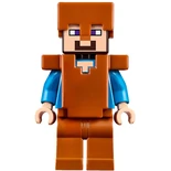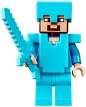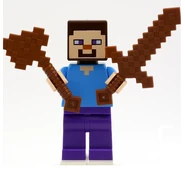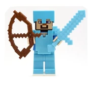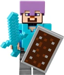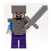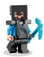 Steve looks the same as his regular minifigure variant, but with the addition of a special pickaxe accessory, and armour. A knight armour piece fits in between the head and torso and represents iron armour.