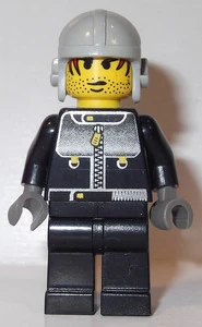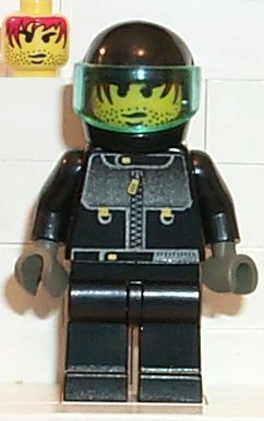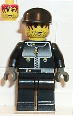 The Stunt Man wears black clothing, with his torso printed with a silver zipper jacket. His gloves are dark grey. His head is reused from Sparks, featuring stubble and red hair. The Stunt Man wears various headgear in different sets, including a black Mini U.S. Cap; a black Mini Crash Helmet with transparent light blue or transparent fluorescent green Mini Visor 2; and a grey Flying Helmet. In 4066 Actor 1, he wears a bright red Mini U.S. Cap and pants.